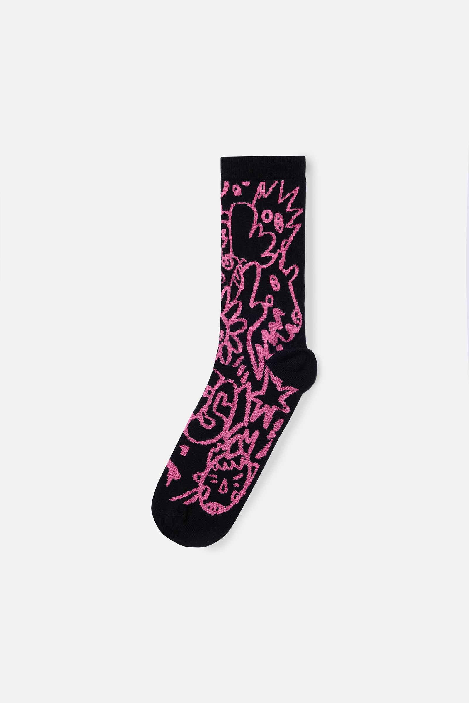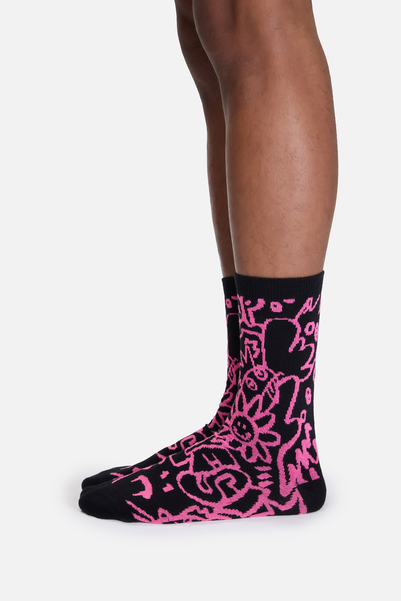 Pink Doodle siyah zemin üzerine atılmış gibi duran pembe el çizimleriyle tam anlamıyla “kuralsız ama bilinçli” bir tasarım. Biraz defter kenarı karalamaları, biraz sokak duvarı, biraz da gece 2’de gelen yaratıcı fikir gibi. Kombin içinde ciddi bir denge kurmak zorunda değilsin; bu model zaten o spontane vibe’ı taşıyor!